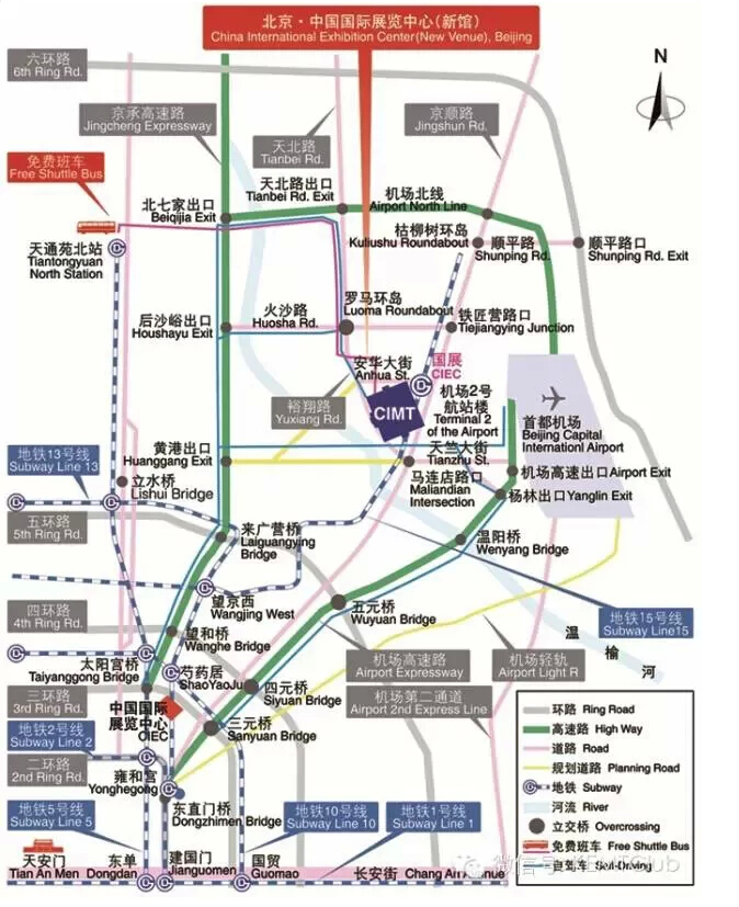 3、北京火車站→新國展:乘坐地鐵2號線在“崇文門站”下車,換乘地鐵5號線到“天通苑北站”下車,再乘免費(fèi)車到新國展。