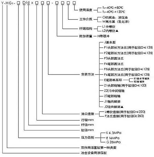 Y-HG1系列冶金設(shè)備用液壓缸為雙作用活塞缸,缸徑一般在40~320mm范圍內(nèi),工作壓力<=16MPA,可用液壓油機械系統(tǒng)損耗乳化液等工作介質(zhì),其安裝方式有法蘭、耳環(huán)、銷軸、腳架(底座)等多種型式。